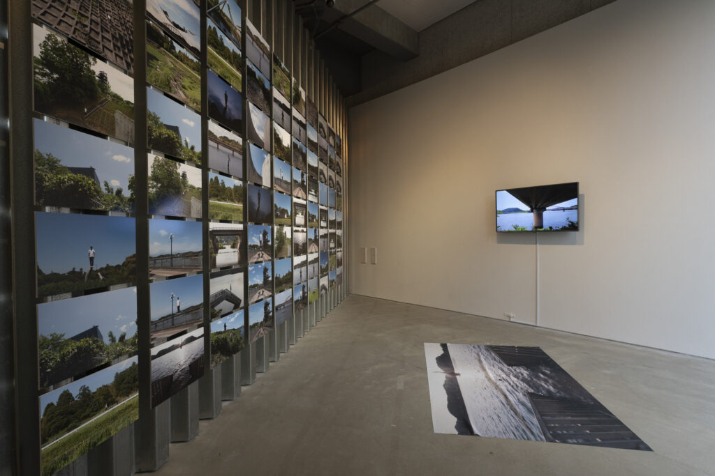 仕切られた小さな展示室には、フリークライマーでもある菊地良太の写真が壁一面に展示されています。菊地は、当館や高滝湖、その周辺のベンチや橋などあるありとあらゆるものに登りその姿を写真に収めています。こんなところに人間が登れるのか、という驚きと今まで自分とは何の関係もなかった人工物に対して何かしらの関わりを持てる瞬間を体験します。