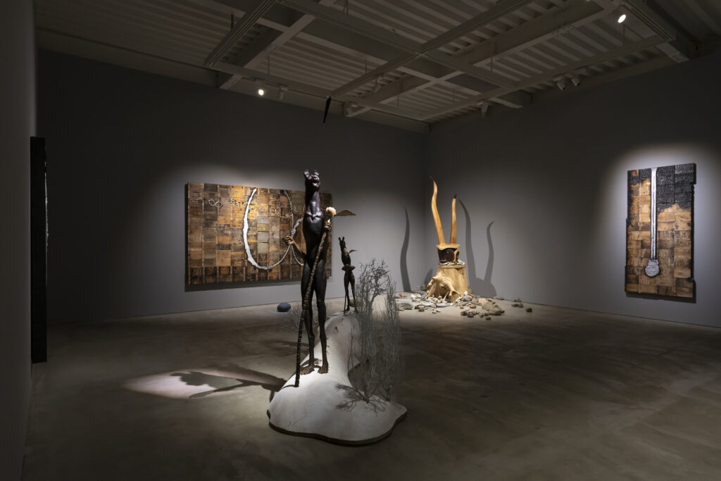加藤の作品の奥には、一つの展示室に尾崎悟と松隈健太朗の作品が寄り添い合うかのように展示されています。尾崎の《涙》《手紙1》《手紙2》は、今年2月に逝去した松隈に捧げられた作品です。アルミやステンレスを使った作品は素材の硬度を感じさせない表現で、私たちが日常で見ている素材の新しい一面を感じることができます。尾崎の作品に囲まれた空間には、松隈によって木に命を吹き込まれた不思議な生き物たちがひっそりと息をしながら私たちを迎え入れます。そのまわりには、養老川やその支流で拾い集めた石、流木、動物の骨が散らされています。