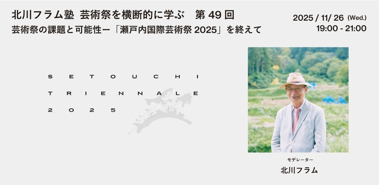 今回の北川フラム塾では、第6回目となる「瀬戸内国際芸術祭2025」を終えて、瀬戸内海地域での芸術祭の課題と今後の可能性・展望を総合ディレクターの北川よりお話しいたします。