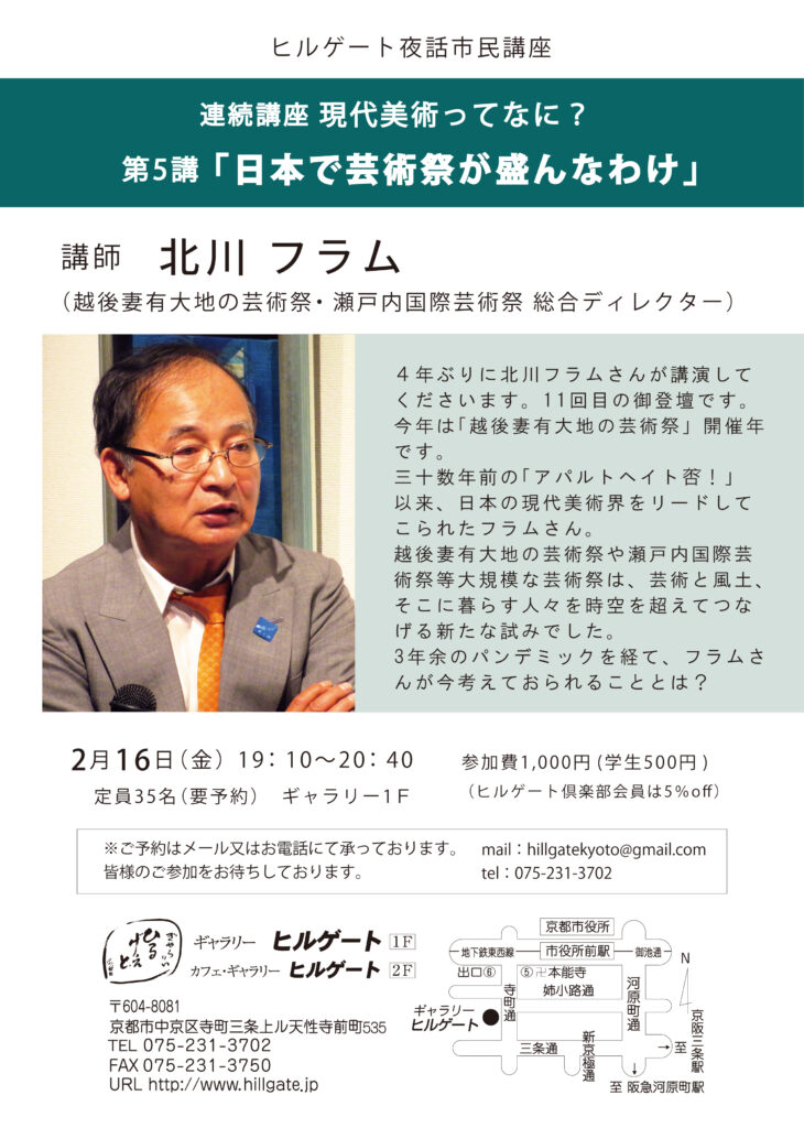 京都のギャラリーヒルゲート主催「ヒルゲート夜話市民講座」に北川フラムが登壇します。今夏開催の、大地の芸術祭をはじめ各地で北川が関わる芸術祭についてお話させていただきます。是非ご参加ください。