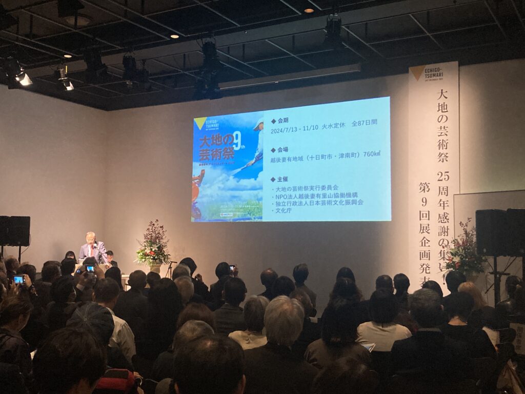 それに向けて、去る11月19日、代官山ヒルサイドテラスにおいて、⼤地の芸術祭実⾏委員会、NPO法⼈越後妻有⾥⼭協働機構、株式会社アートフロントギャラリーが「⼤地の芸術祭25周年感謝の集い! 第9回展企画発表会」を共催しました。当日は、越後妻有から住民の方たちがバス4台で駆け付け、この四半世紀の歩みにさまざまな形で関わってくださった400名が集いました。