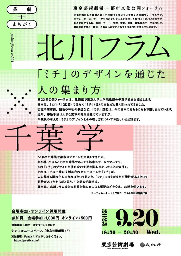 第23回目となる「芸劇+まちがく」東京芸術劇場+都市文化公開フォーラムは、建築家の千葉学氏を迎え「ミチ」のデザインを通じた人の集まり方をテーマにお話しを伺います。ぜひご参加ください。
