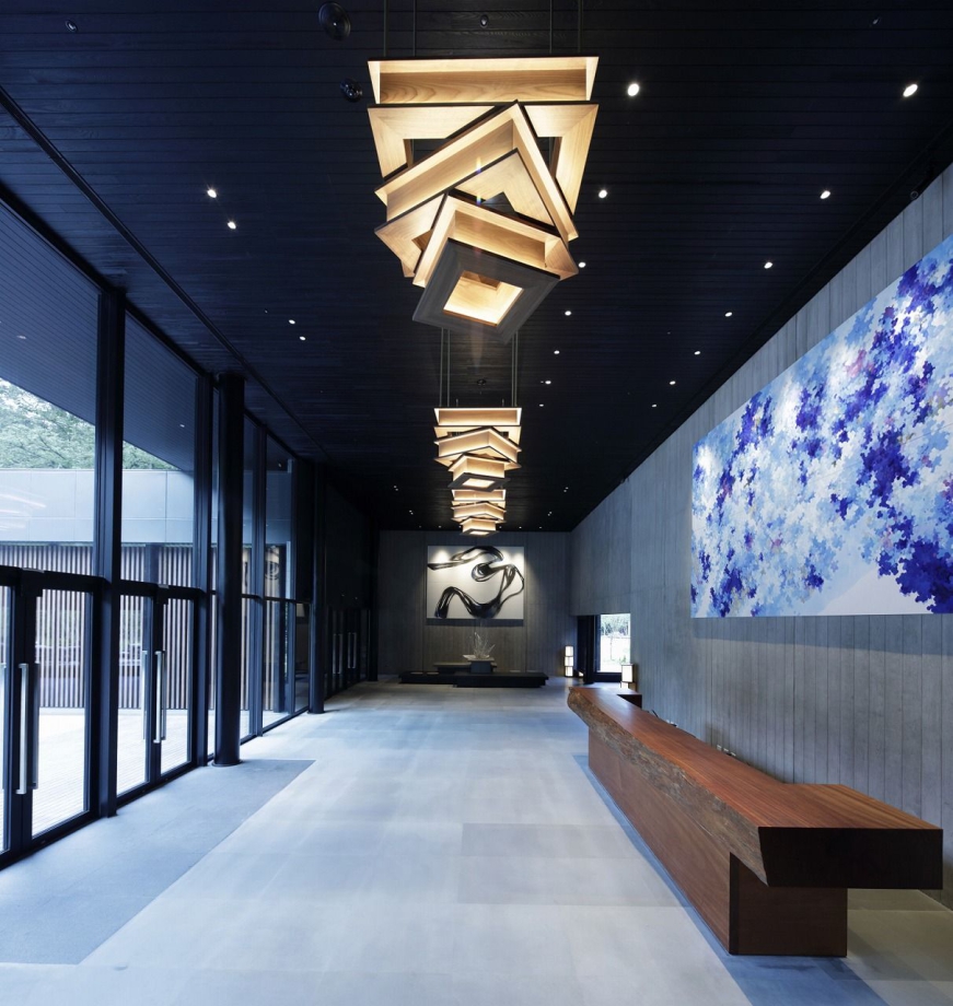 台湾・台中駅から東へ車で1時間半の山あいで昔からの温泉保養地の中心部より一段高い一角に星のやGuguanは完成しました。この施設ではゲストはどこにいても水の気配に包まれ木漏れ日と水音の中を自由に散策できます。アート計画では、水・光・生命をテーマに台湾人作家3名を含む28名の作家に特注制作を依頼して111作品が配置されました。